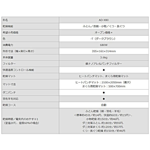 【商品スペック】 ●型式:ADX80(T(AD‐X80‐T (ダークブラウン)) ●本体サイズ:幅×高さ×奥行き(mm):約355×314×161 ●本体重量:約3.6Kg ●消費電力:680W ●電源:交流100V 50-60Hz ●電源コード:1.9m ●フィルター(吸込口):銀ナノアレルパンチフィルター