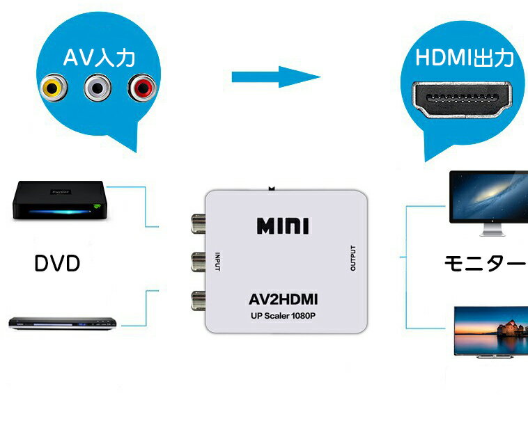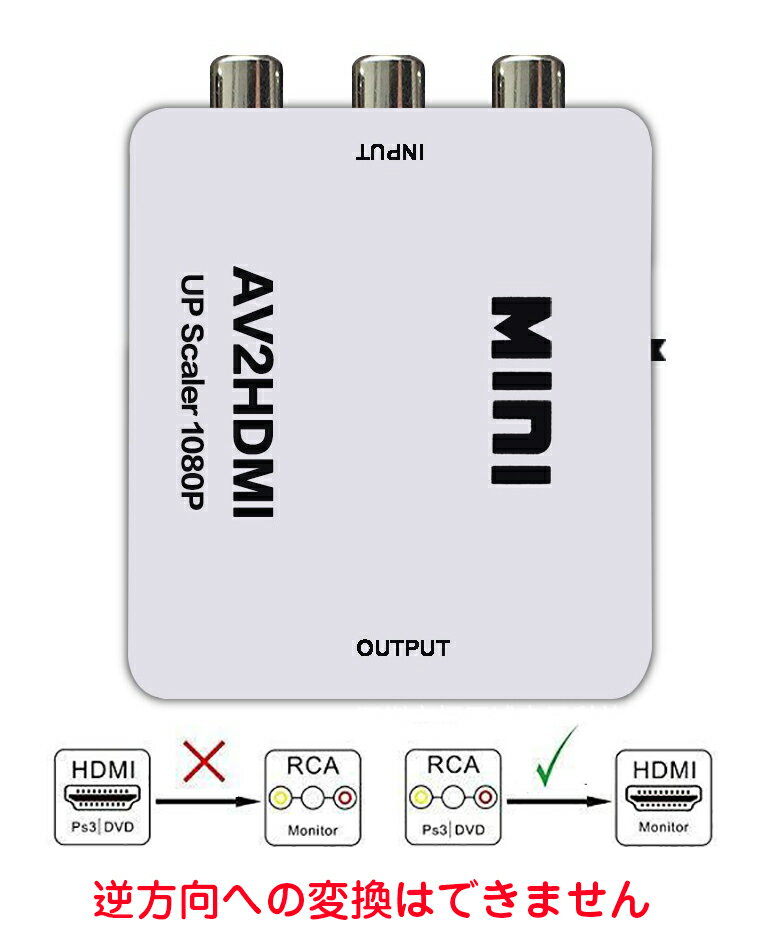 商品仕様 商品内容:本体×1、給電USBケーブル×1 カラー:ホワイト、ブラック 入力端子:コンポジット 映像 / アナログ音声L/R各x1 出力端子:HDMI 出力信号:PAL / NTSC 2段切替え可能 対応解像度: 480p、720p、1080p ※注意:本体は給電口からの電流で動作するため、ご利用の際に必ず付属したケーブルで給電してください。